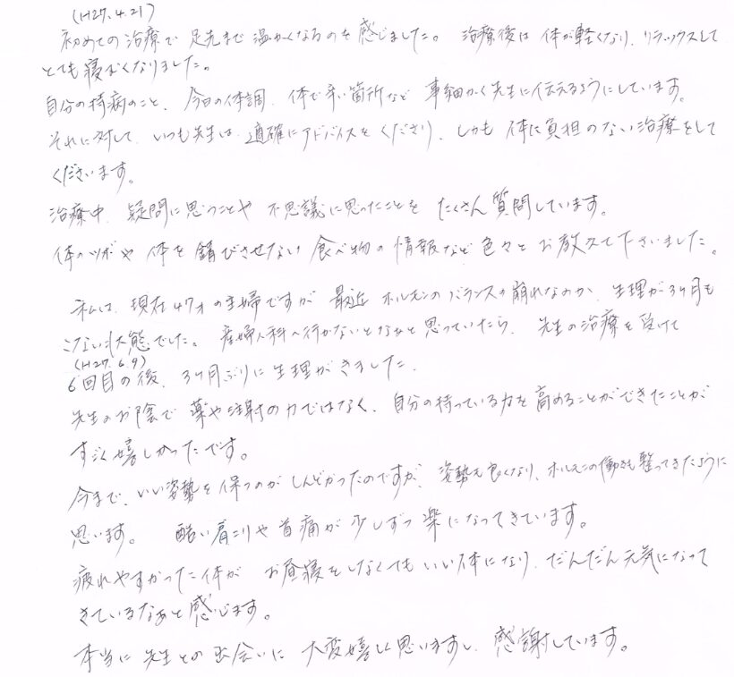 初めての治療で足先まで温かくなるのを感じました。治療後は体が軽くなりリラックスしてとても眠くなりました。自分の持病のこと、今日の体調、体で辛い箇所など事細かく伝えるようにしています。それに対していつも先生は適確にアドバイスをくださり、しかも体に負担のない治療をしてくださいます。治療中、疑問に思うことや不思議に思ったことをたくさん質問しています。体のツボや体を錆びさせない食べ物の情報など色々と教えて下さいました。 私は現在47才の主婦ですが、最近ホルモンのバランスの崩れなのか生理が3か月もこない状態でした。産婦人科に行かないとなぁと思っていたら、先生の治療を受けて6回目の後3か月ぶりに生理がきました。先生のお陰で薬や注射の力ではなく、自分の持っている力を高めることができたことがすごく嬉しかったです。今まで、いい姿勢を保つのがしんどかったのですが、姿勢もよくなり、ホルモンの働きも整ってきたように思います。酷い肩こりや首痛が少しずつ楽になってきています。疲れやすかった体がお昼寝をしなくてもいい体になり、だんだん元気になってきているなぁと感じます。本当に先生との出会いに大変嬉しく思いますし、感謝しています。