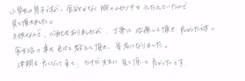 N・Yさん 小学生の男の子のお母さん 和歌山市 食欲なく胸のムカツキ