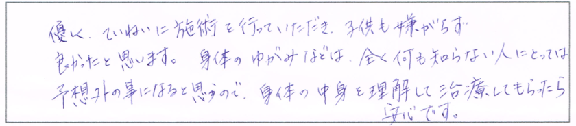 やさしくていねいに施術を行っていただき、子供も嫌がらず良かったと思います。