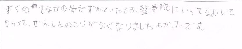 ぼくのせなかの骨がずれていたとき、整骨院にいってなおしてもらって、ぜんしんのこりがなくなりました。よかったです。